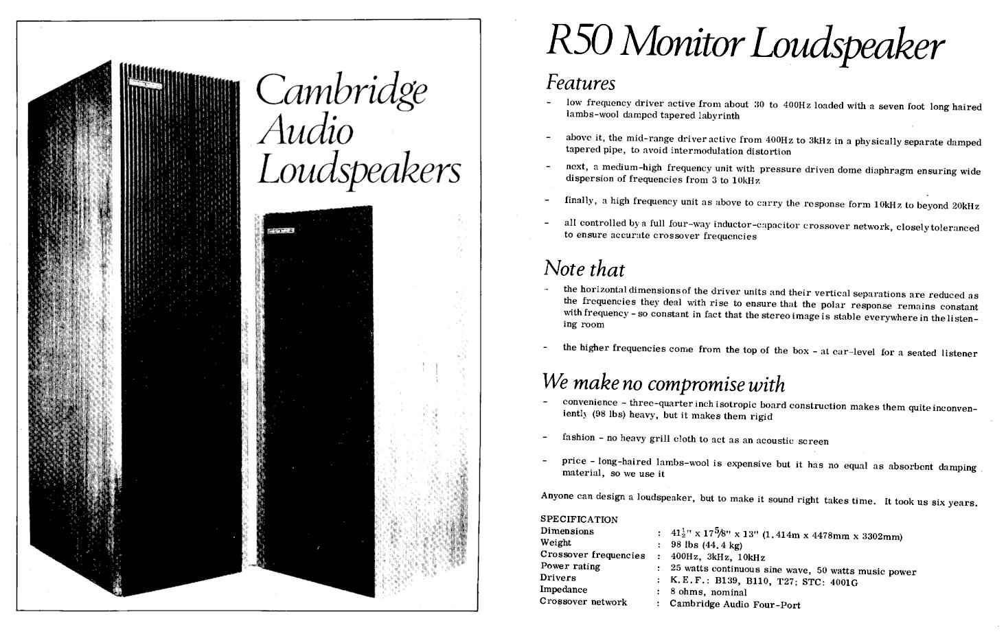 1971年劍橋音響開發了R50傳輸線式音響,R50音響采用七英尺錐形迷宮構造,長羊毛減震設計。所有這些全都有助于減少失真,而且效果明顯,至今仍舊是揚聲器開發的標桿型作品!