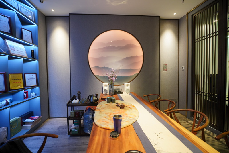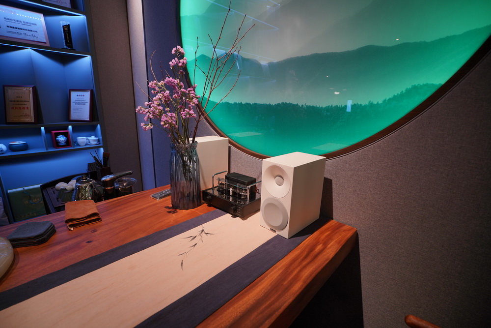 首先我們來看看位于客廳的茶室。總聽人說“禪茶一味”,品茶時豈能少的了音樂。茶臺上一對芬蘭之聲Amphion Helium 410揚聲器+Blue Aura V32電子管功放,小巧玲瓏的桌面HIFI,讓人可以輕松的享受高品質音樂。