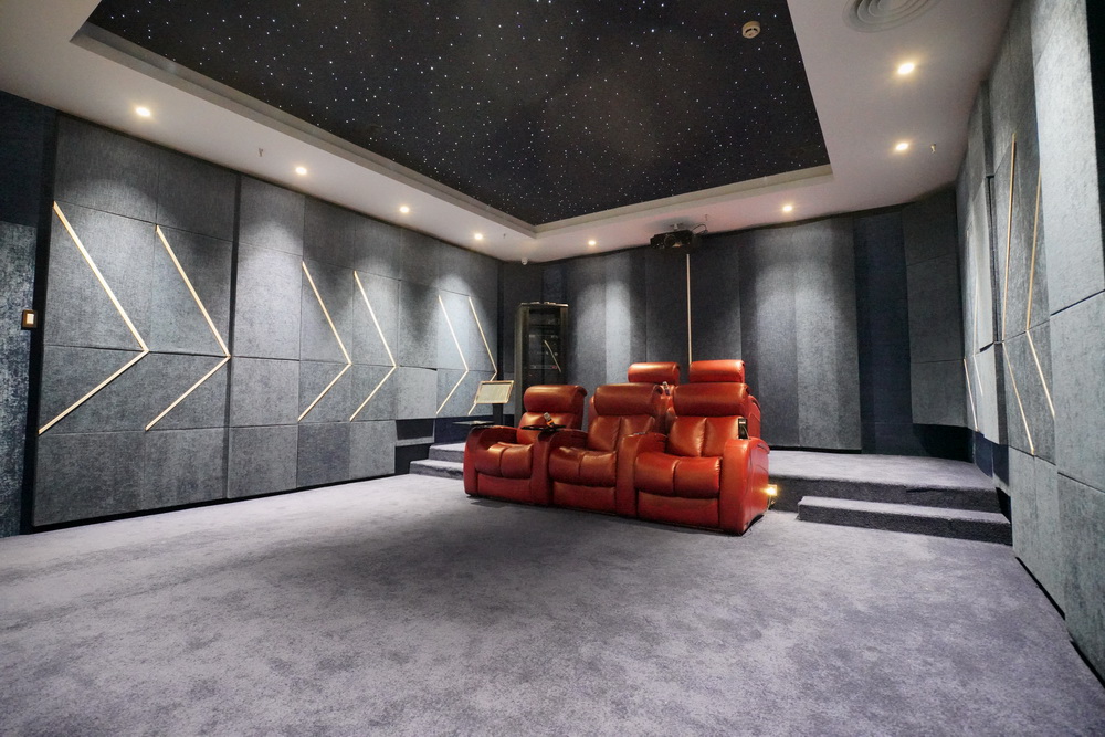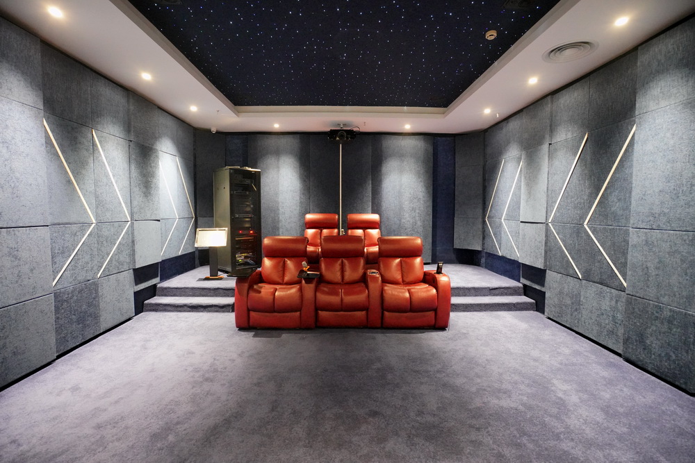 整個視聽室為我們展現了藝術與光的完美搭配,采用了幾種不同的燈具來烘托氣氛,深色系的墻面設計與錯落有致的燈光形成浪漫時尚的整體環境,再搭配專業的高保真影音效果,營造出高端舒適的視聽環境。