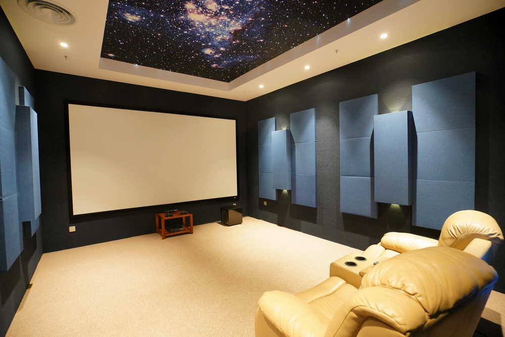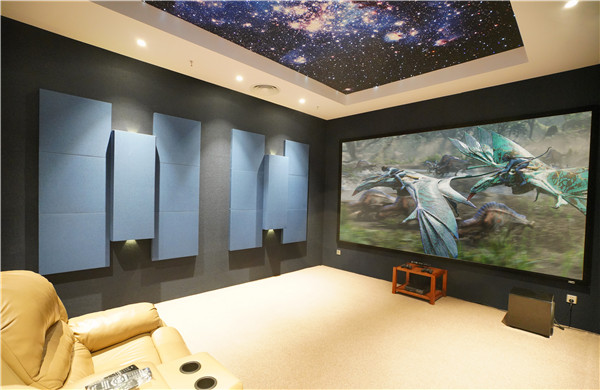 整個視聽室的裝修設計還是相對簡單,并沒有太復雜的構造,只是通過簡單的裝飾,和內部隱蔽的聲學材料來構建整個房間的聲音環境。同時也兼顧卡拉OK和極品影院。雖然說裝修裝飾簡單,但是影院的效果卻是一點也不簡單。要知道這屏幕后面是采用James 808BE每一只擁有4只BE鈹高音,2只6.5寸中音,2只8寸低音,所以在高中低頻都有非常出眾的表現,特別是四向矩陣BE高音,能夠產生最為細膩明亮的聲音表現。