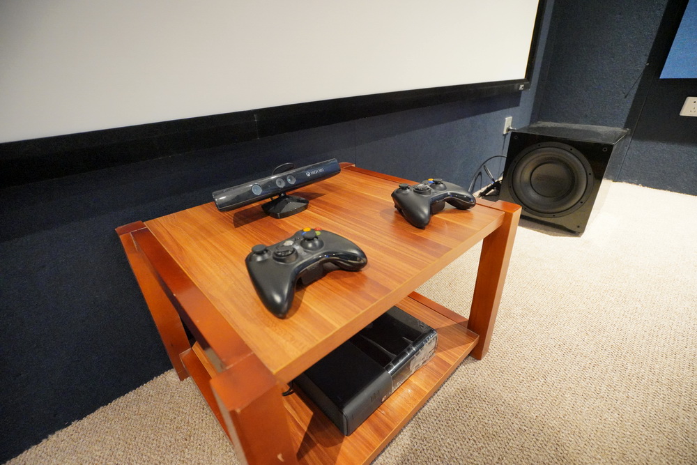 在這個視聽室前面特別放置了一個小機架,這個機架上不放任何的影音設備,但正兒八經的放置的是一臺XBOX360游戲機,兩個游戲手柄和動感游戲的視頻感應器,其實在這種的空間中玩游戲是大部分年輕人最常見的娛樂形式,倒不一定是看電影,其實本來這個空間就想要表達的是,私人影院并不一定去嚴格的糾結聲學環境,調試頻段,其實只要一個舒適的空間,不管是游戲還是電影還是唱歌,都是舉家最歡樂的地方。